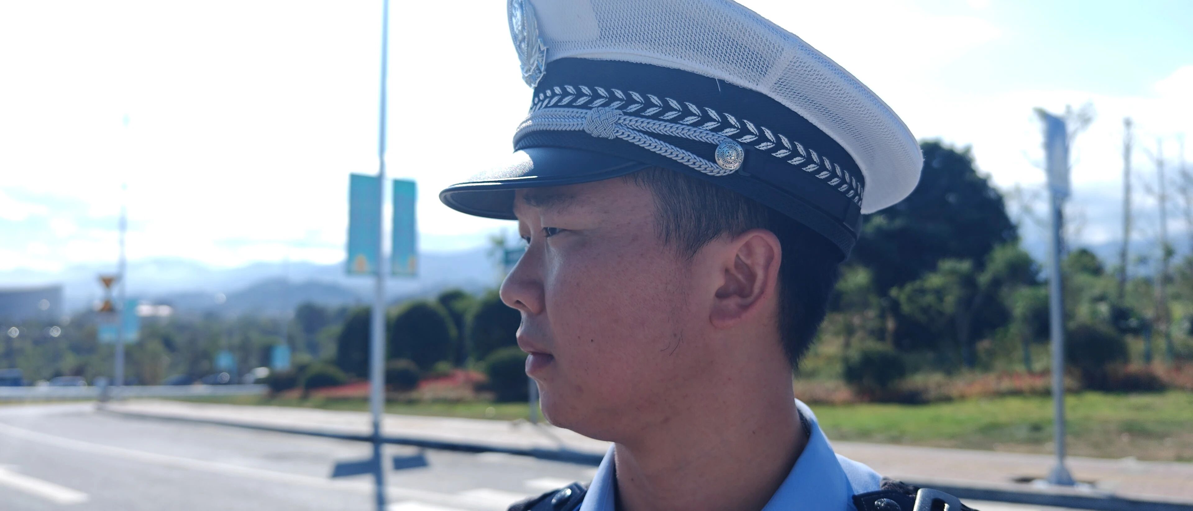 警帽下的汗水順著臉頰滑落