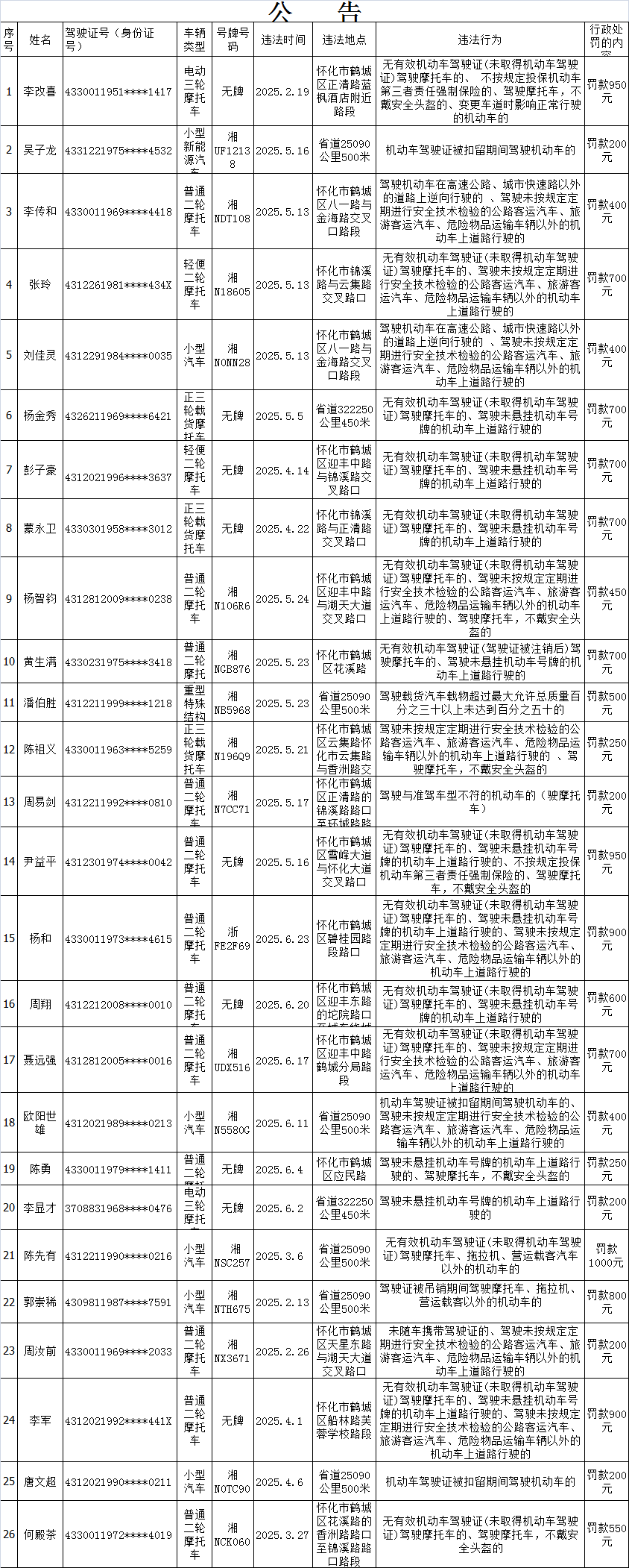 下列道路交通違法行為人(附名單以及交通違法的事實、法律依據、處罰種類、罰款金額等相關內容),因涉嫌實施了附后所列舉的道路交通安全違法行為,根據《中華人民共和國道路交通安全法》等法律法規,擬應依法給予相應的行政處罰。因道路交通違法行為人無正當理由未在法定期限內來我大隊接受處理,且經我隊采取電話、郵寄、公告等方式依法告知,在告知期滿后三十日內仍未來我隊接受處理。現依據《湖南省實施<中華人民共和國道路交通安全法>辦法》第46條第2款的規定,我隊依法予以公告,公告期為七日。請以下道路交通違法行為人在公告期內及時來我大隊(地址:懷化市鶴城區迎豐中路475號)接受處理,如有異議有權提出陳述和申辯,處吊銷機動車駕駛證或者單筆罰款金額超過二千元的處罰還可申請聽證。逾期,我隊將依法作出行政處罰決定。
