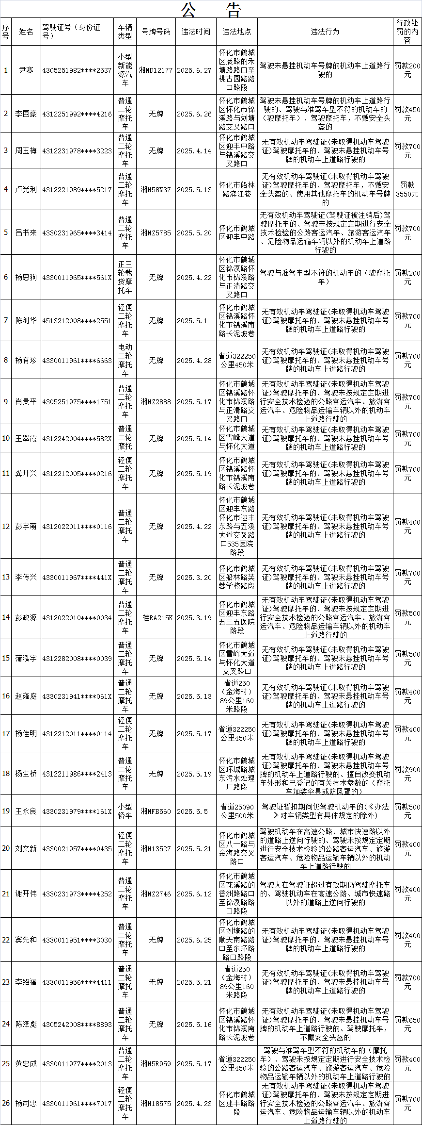 下列道路交通違法行為人(附名單以及交通違法的事實、法律依據、處罰種類、罰款金額等相關內容),因涉嫌實施了附后所列舉的道路交通安全違法行為,根據《中華人民共和國道路交通安全法》等法律法規,擬應依法給予相應的行政處罰。因道路交通違法行為人無正當理由未在法定期限內來我大隊接受處理,且經我隊采取電話、郵寄、公告等方式依法告知,在告知期滿后三十日內仍未來我隊接受處理?,F依據《湖南省實施<中華人民共和國道路交通安全法>辦法》第46條第2款的規定,我隊依法予以公告,公告期為七日。請以下道路交通違法行為人在公告期內及時來我大隊(地址:懷化市鶴城區迎豐中路太平橋)接受處理,如有異議有權提出陳述和申辯,處吊銷機動車駕駛證或者單筆罰款金額超過二千元的處罰還可申請聽證。逾期,我隊將依法作出行政處罰決定。